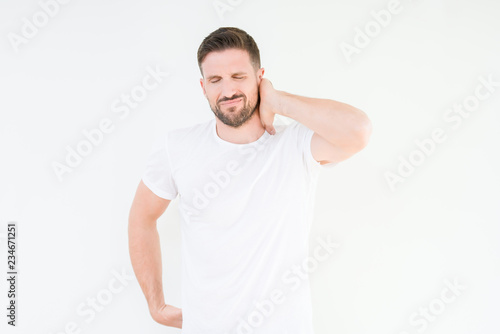 Young handsome man wearing casual white t-shirt over isolated background Suffering of neck ache injury, touching neck with hand, muscular pain