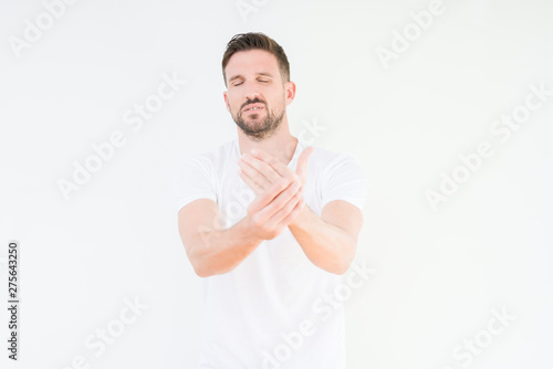Young handsome man wearing casual white t-shirt over isolated background Suffering pain on hands and fingers, arthritis inflammation