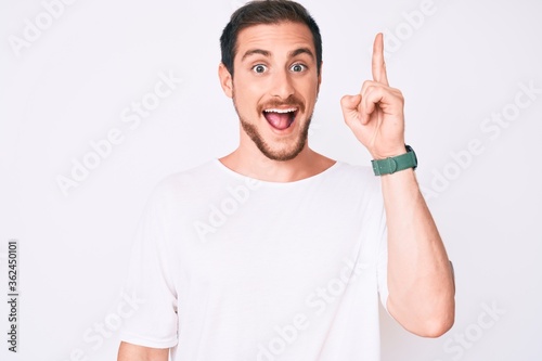 Young handsome man wearing casual white tshirt pointing finger up with successful idea. exited and happy. number one.