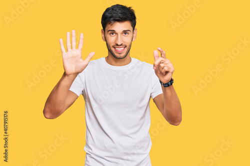 Young handsome man wearing casual white tshirt showing and pointing up with fingers number six while smiling confident and happy.