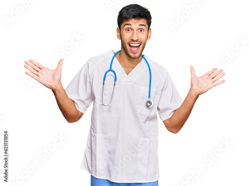 Young handsome man wearing doctor uniform and stethoscope celebrating victory with happy smile and winner expression with raised hands