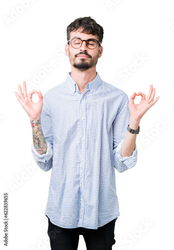 Young handsome man wearing glasses over isolated background relax and smiling with eyes closed doing meditation gesture with fingers. Yoga concept.