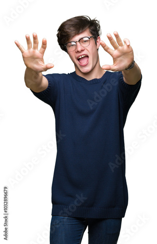 Young handsome man wearing glasses over isolated background showing and pointing up with fingers number nine while smiling confident and happy.