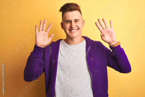 Young handsome man wearing purple sweatshirt standing over isolated yellow background showing and pointing up with fingers number nine while smiling confident and happy.