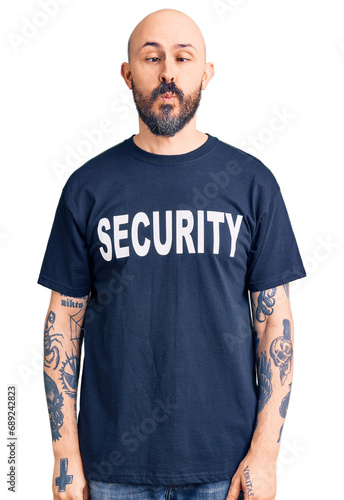 Young handsome man wearing security t shirt making fish face with lips, crazy and comical gesture. funny expression.