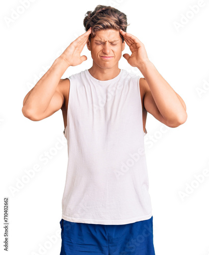 Young handsome man wearing sleveeless t shirt suffering from headache desperate and stressed because pain and migraine. hands on head.