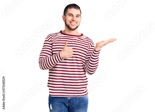 Young handsome man wearing striped sweater showing palm hand and doing ok gesture with thumbs up, smiling happy and cheerful