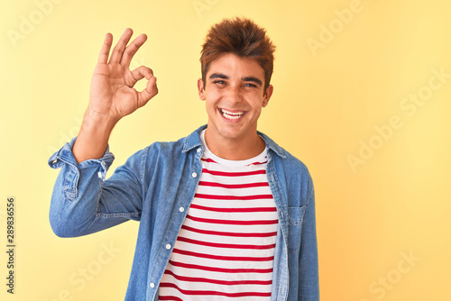 Young handsome man wearing striped t-shirt and denim shirt over isolated yellow background smiling positive doing ok sign with hand and fingers. Successful expression.