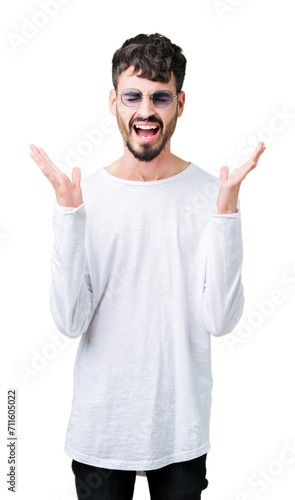 Young handsome man wearing sunglasses over isolated background celebrating mad and crazy for success with arms raised and closed eyes screaming excited. Winner concept