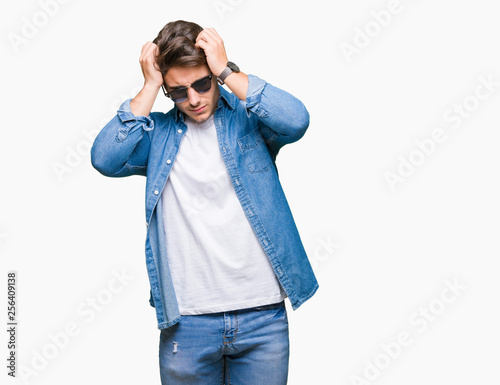 Young handsome man wearing sunglasses over isolated background suffering from headache desperate and stressed because pain and migraine. Hands on head.