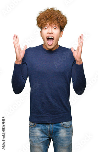 Young handsome man with afro hair celebrating crazy and amazed for success with arms raised and open eyes screaming excited. Winner concept