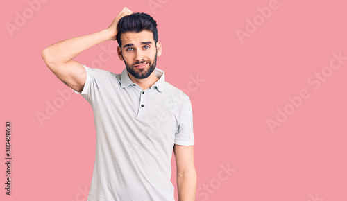 Young handsome man with beard wearing casual polo confuse and wonder about question. uncertain with doubt, thinking with hand on head. pensive concept.