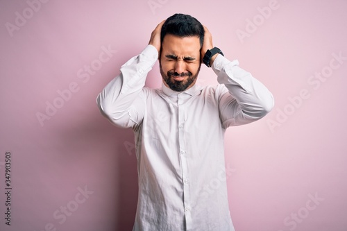 Young handsome man with beard wearing casual shirt standing over pink background suffering from headache desperate and stressed because pain and migraine. Hands on head.