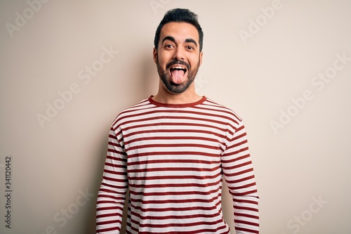 Young handsome man with beard wearing casual striped t-shirt standing over white background sticking tongue out happy with funny expression. Emotion concept.