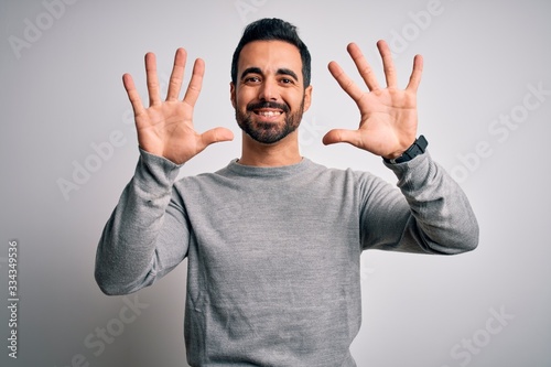 Young handsome man with beard wearing casual sweater standing over white background showing and pointing up with fingers number ten while smiling confident and happy.
