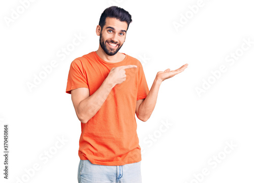 Young handsome man with beard wearing casual t-shirt amazed and smiling to the camera while presenting with hand and pointing with finger.
