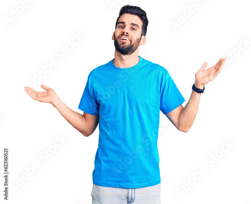 Young handsome man with beard wearing casual t-shirt clueless and confused expression with arms and hands raised. doubt concept.