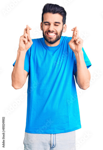 Young handsome man with beard wearing casual t-shirt gesturing finger crossed smiling with hope and eyes closed. luck and superstitious concept.