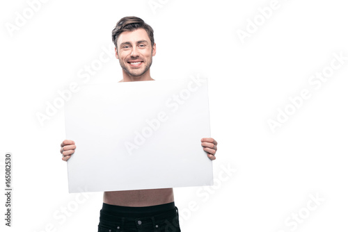 young handsome man with blank banner, isolated on white