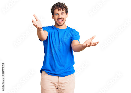 Young handsome man with curly hair wearing casual clothes smiling cheerful offering hands giving assistance and acceptance.