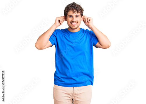Young handsome man with curly hair wearing casual clothes smiling pulling ears with fingers, funny gesture. audition problem