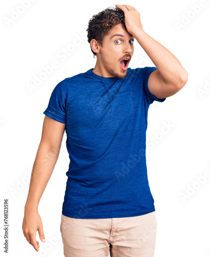Young handsome man with curly hair wearing casual clothes surprised with hand on head for mistake, remember error. forgot, bad memory concept.