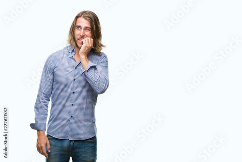 Young handsome man with long hair over isolated background looking stressed and nervous with hands on mouth biting nails. Anxiety problem.