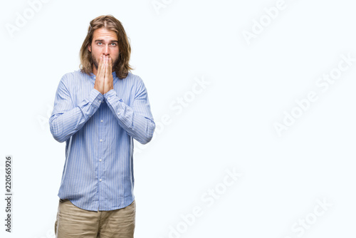 Young handsome man with long hair over isolated background shocked covering mouth with hands for mistake. Secret concept.