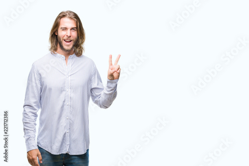 Young handsome man with long hair over isolated background smiling with happy face winking at the camera doing victory sign. Number two.