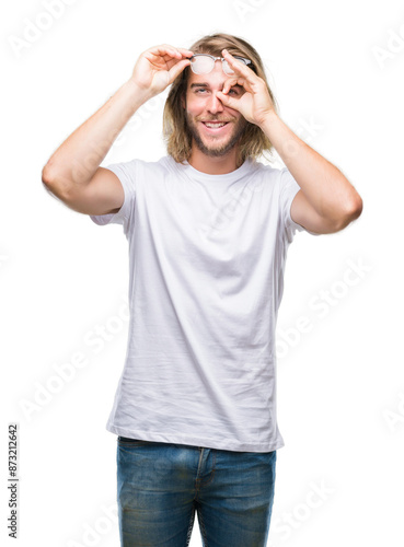 Young handsome man with long hair wearing glasses over isolated background doing ok gesture with hand smiling, eye looking through fingers with happy face.