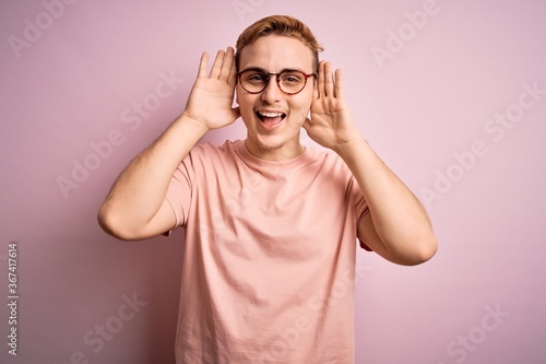 Young handsome redhead man wearing casual t-shirt standing over isolated pink background Smiling cheerful playing peek a boo with hands showing face. Surprised and exited