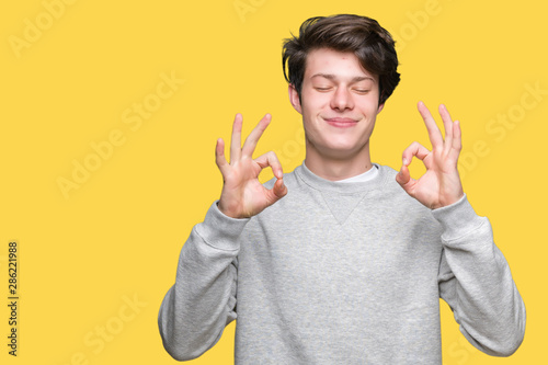 Young handsome sporty man wearing sweatshirt over isolated background relax and smiling with eyes closed doing meditation gesture with fingers. Yoga concept.