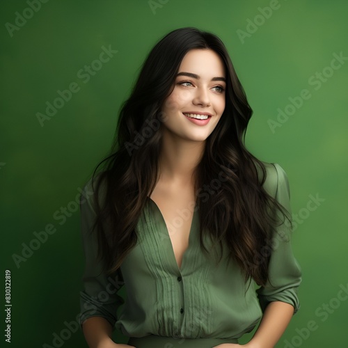 young happy female model standing in front of a green background, long hair , presenting her clothes