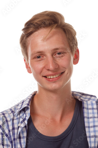 Young happy looking up man close up portrait.