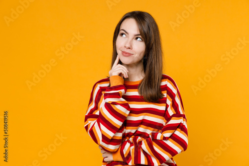 Young happy minded wistful caucasian woman 20s in red striped sweatshirt look aside on workspace area mock up prop up chin isolated on plain yellow background studio portrait People lifestyle concept