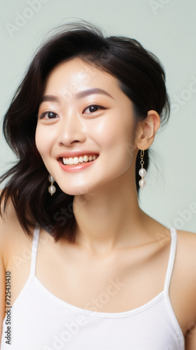 Young happy smiling Asian woman model wearing tshirt looking at camera on color background. Face skin hair care korean cosmetic and makeup, fashion ads. Beauty portrait. White t-shirt mock up template