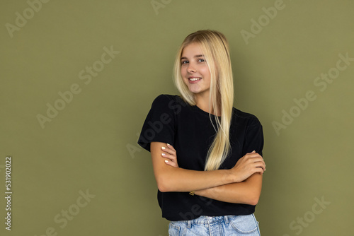 Young happy swoman isolated on plain olive green khaki background studio. People lifestyle concept
