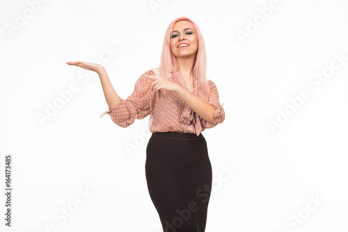Young happy woman portrait of a confident businesswoman showing presentation, pointing placard background. Ideal for banners, registration forms, presentation, landings, presenting concept.