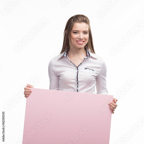 Young happy woman portrait of a confident businesswoman showing presentation, pointing placard pink background. Ideal for banners, registration forms, presentation, landings, presenting concept..