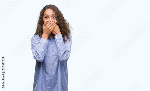 Young hispanic business woman shocked covering mouth with hands for mistake. Secret concept.