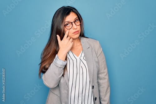 Young hispanic business woman wearing glasses standing over blue isolated background Pointing to the eye watching you gesture, suspicious expression