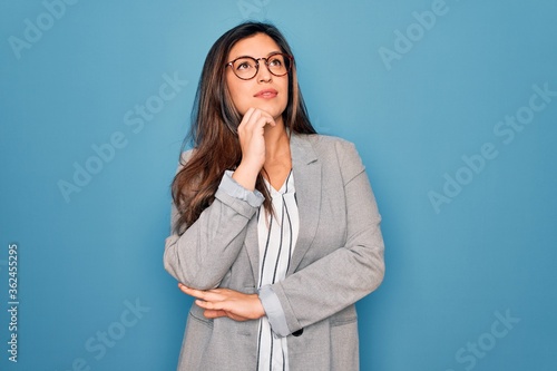Young hispanic business woman wearing glasses standing over blue isolated background with hand on chin thinking about question, pensive expression. Smiling and thoughtful face. Doubt concept.