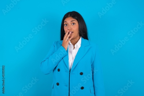 young hispanic businesswoman wearing blue blazer over blue background covers mouth and looks with wonder at camera, cannot believe unexpected rumors.