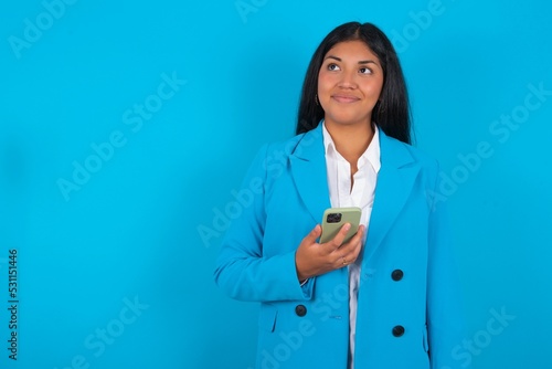 young hispanic businesswoman wearing blue blazer over blue background holds mobile phone uses high speed internet and social networks has online communication. Modern technologies concept