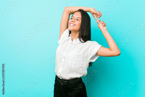 Young hispanic cool woman against a blue wall stretching arms, relaxed position.