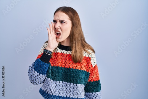 Young hispanic girl standing over blue background shouting and screaming loud to side with hand on mouth. communication concept.