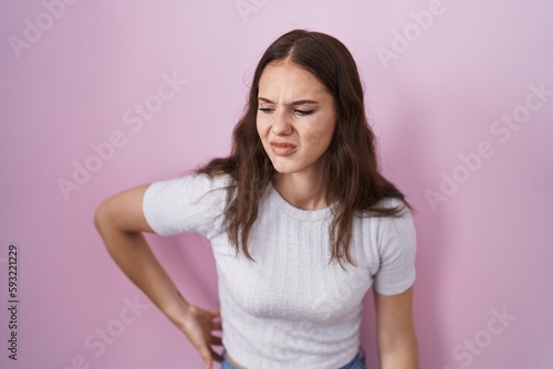 Young hispanic girl standing over pink background suffering of backache, touching back with hand, muscular pain