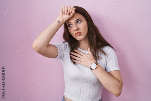 Young hispanic girl standing over pink background touching forehead for illness and fever, flu and cold, virus sick