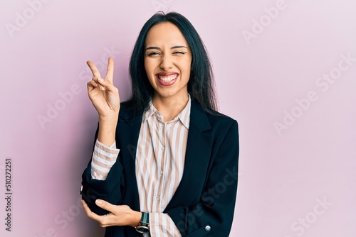 Young hispanic girl wearing business clothes smiling with happy face winking at the camera doing victory sign. number two.