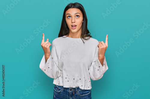 Young hispanic girl wearing casual clothes amazed and surprised looking up and pointing with fingers and raised arms.